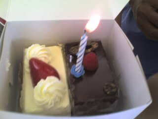 HAHA! evil us~ nvm.. we stil got him 2 pieces of cake!~ =) choco exotic and strawberry shortcake~